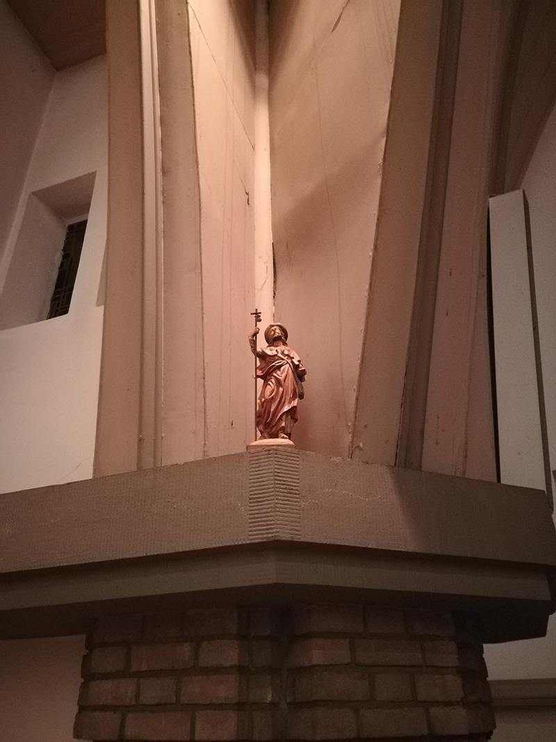 Wie goed rondkijkt in de Pelgrimskerk, ontdekt – hoog en droog – een nieuwe pelgrim. Zijn naam is Jacobus, beschermheilige van pelgrims en alle mensen onderweg. De bekende pelgrimswegen naar Santiago de Compostella zijn al eeuwen lang met zijn naam verbonden.